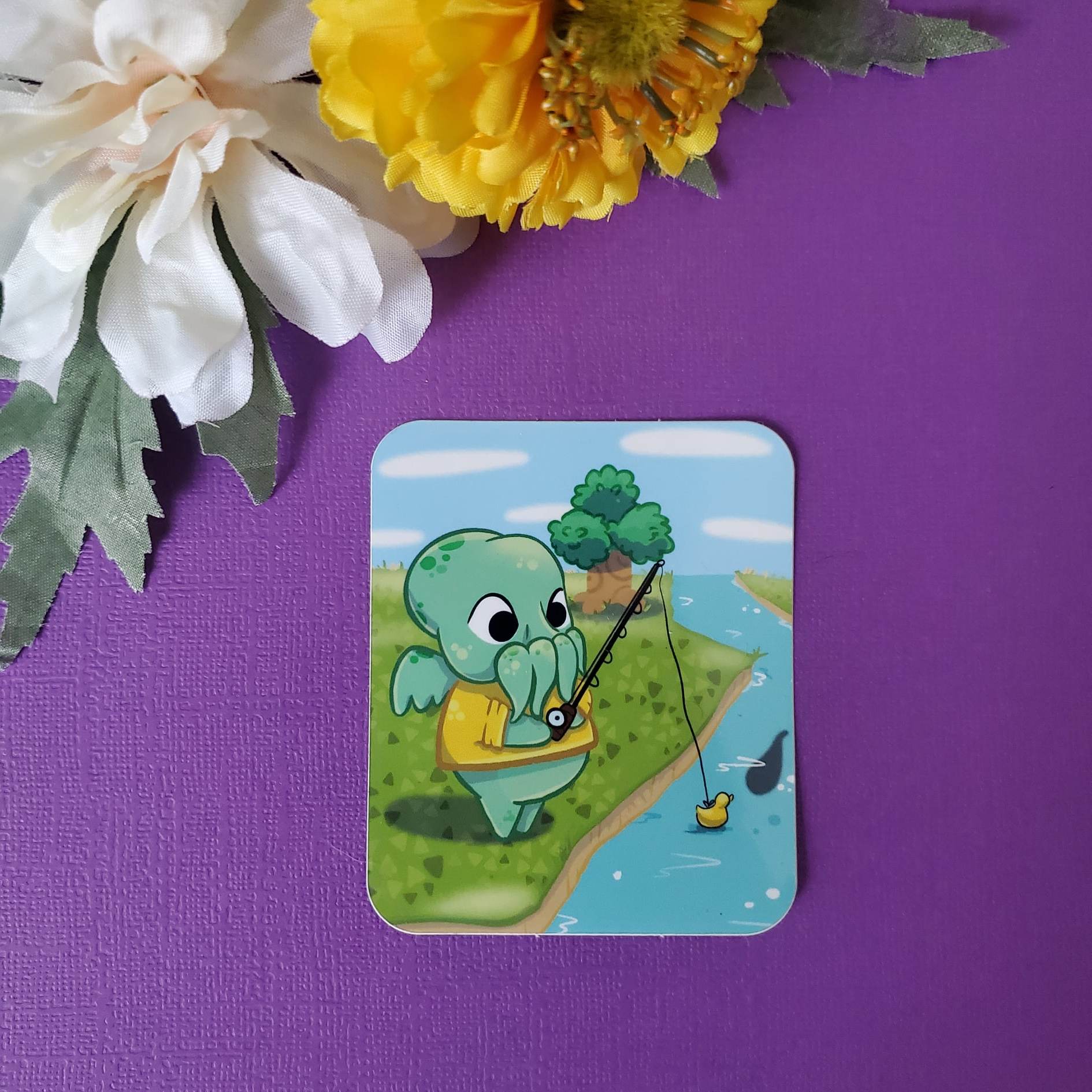 Enter the realm of adorable horror with our Cthuluger Sticker! Featuring a mash-up of an Animal Crossing villager and Cthulhu, it's a tentacularly cute addition to any sticker collection.
