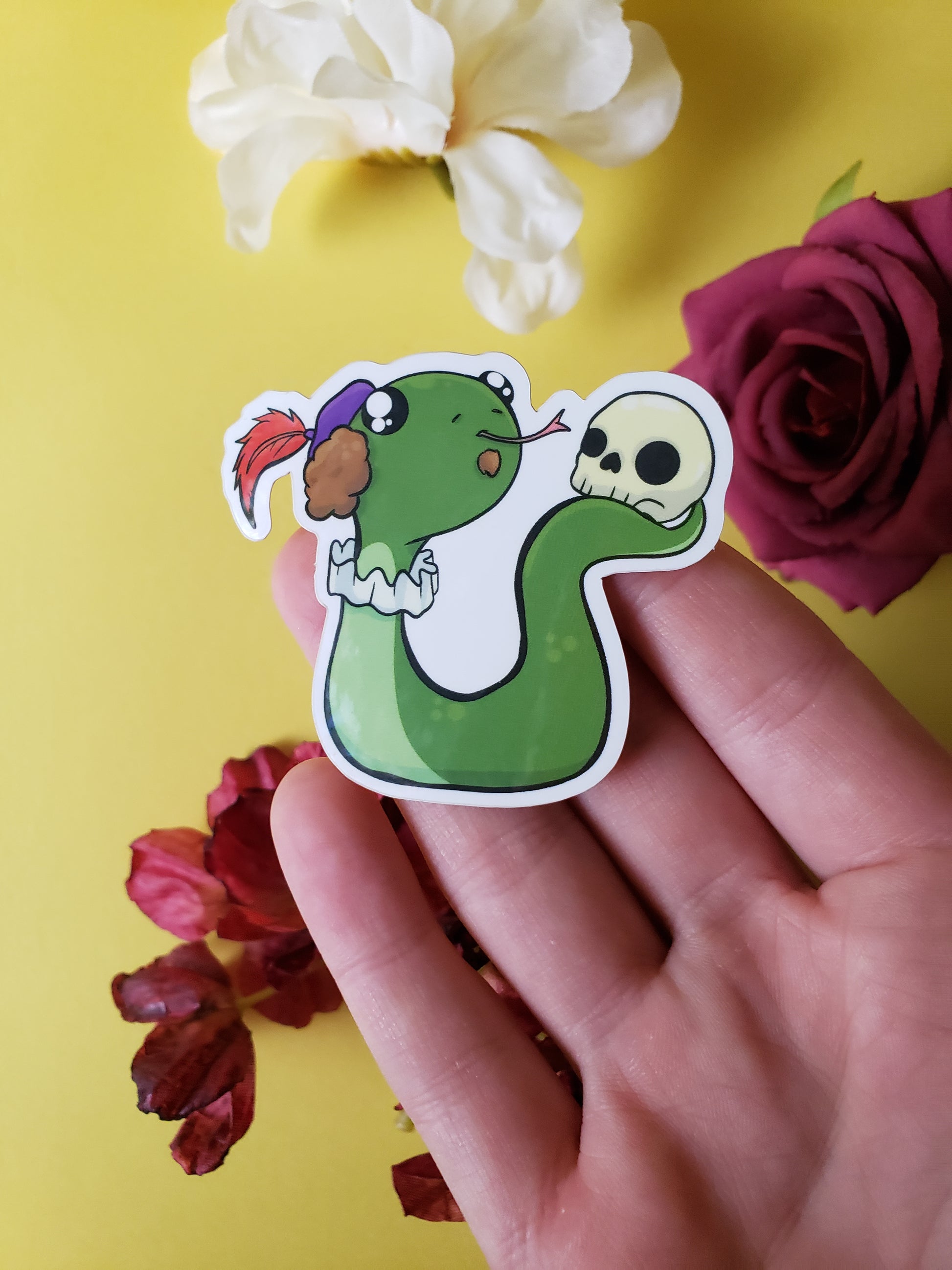 Get literary with our William Snakespeare Sticker! Featuring a charming snake bard, it's a witty addition to any sticker collection that's sure to make you smile.